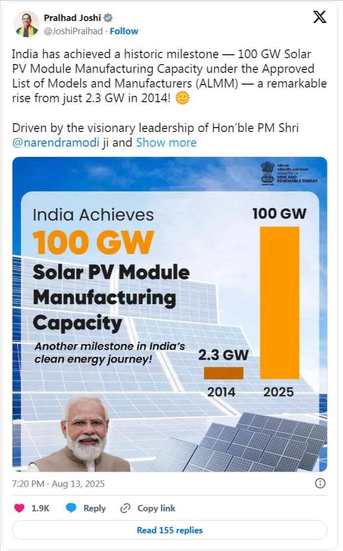 Prahad Joshi, Minister Indyjskiego Sojuszu na rzecz Nowej Energii Odnawialnej, podkreślił to osiągnięcie, stwierdzając: „Indie osiągnęły historyczny kamień milowy – zgodnie z listą zatwierdzonych modeli i producentów (ALMM) moc produkcyjna modułów fotowoltaicznych osiągnęła 100 gigawatów, co stanowi znaczny wzrost z 2,3 gigawatów w 2014 r.! Pod wizjonerskim przywództwem premiera Narendry Modiego i siłą napędową inicjatyw transformacyjnych, takich jak w ramach programu motywacyjnego powiązanego z produkcją modułów fotowoltaicznych (PLI) Indie budują silny i samowystarczalny ekosystem produkcji modułów fotowoltaicznych. To osiągnięcie przyspieszy tempo w kierunku Atmanirbhar Bharat i pomoże Indiom osiągnąć cel, jakim jest osiągnięcie 500 gigawatów mocy produkcyjnej energii niekopalnej do roku 2030